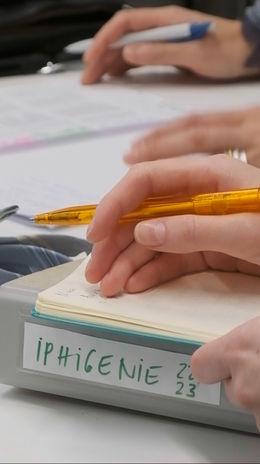 In der zweiten Woche von «Iphigénie» geht es auf der Probebühne mit voller Energie weiter. In der Schneiderei werden die Kostüme angepasst und das Bühnenbild wird mit vereinter Kraft aufgebaut.